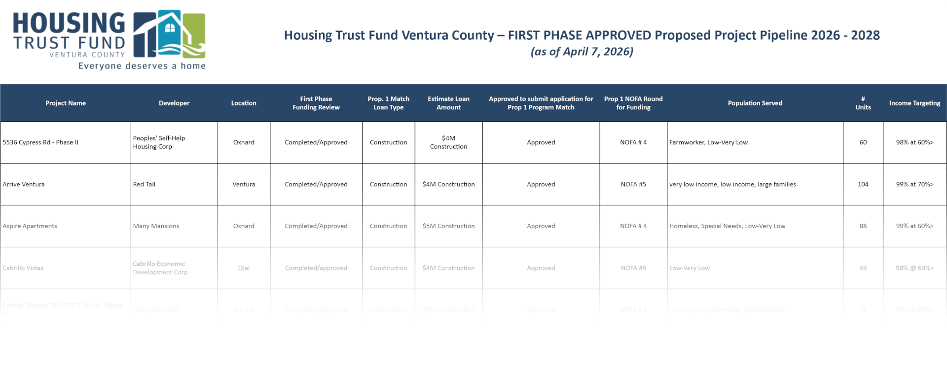 In 2017, HTFVC eliminated its pre-application process for loan requests. Today, we encourage developers to contact Linda Braunschweiger to discuss pipeline projects, timeline for funding needs, and our availability of lending capital. An invitation to submit a formal application will be provided if the project fits our lending model, unit goals, and populations served by the development. We encourage developers interested in developing affordable housing in VC to reach out to us at any time. The following chart showing first phase approvals changes regularly.